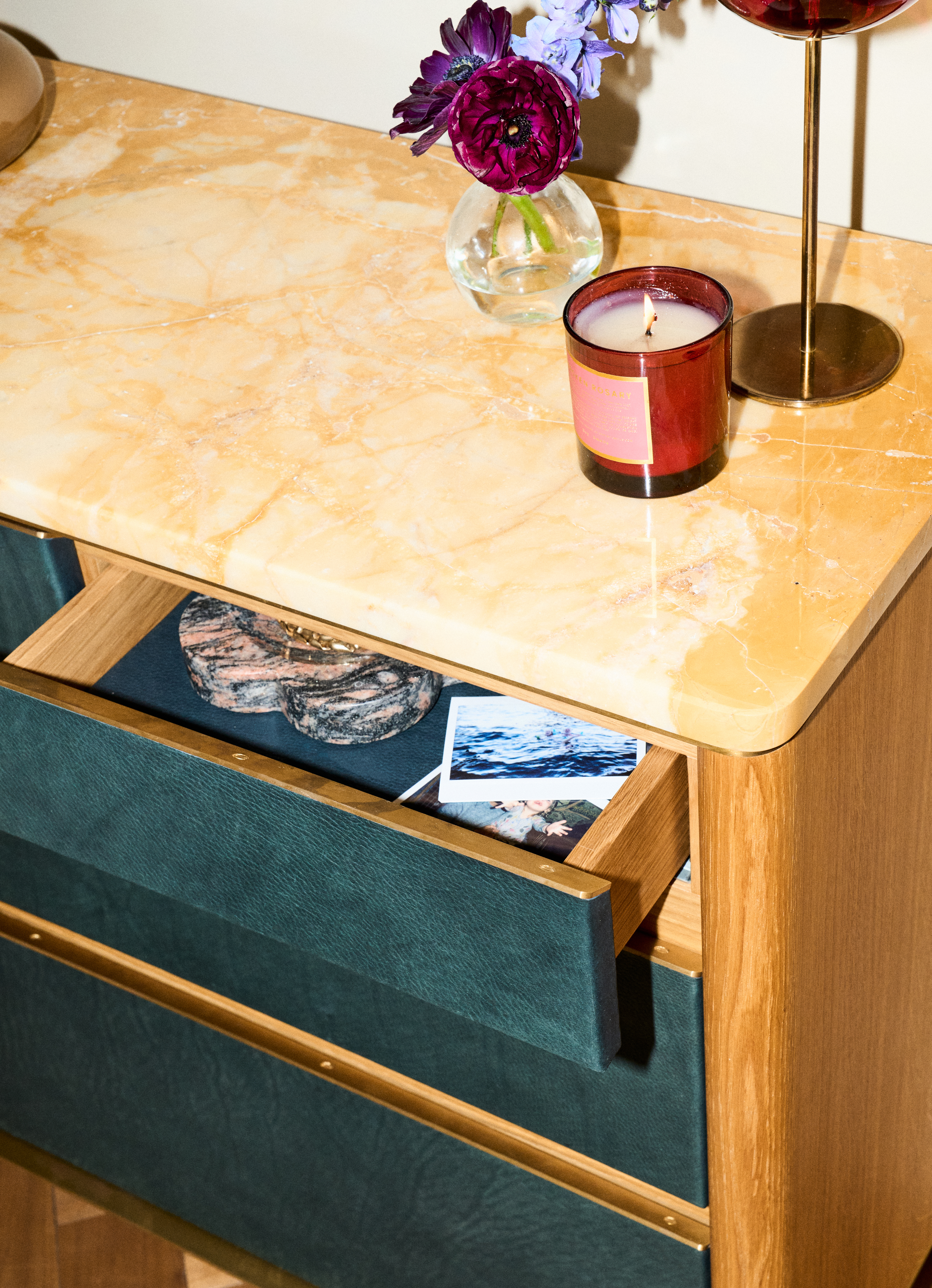 Also, you have four different materials in one piece of furniture: the outside is oak, there’s a blue-ish leather on the outside, all drawers are lined in the same leather, there is a yellow marble on top, and it has brass accents. It’s beautiful.